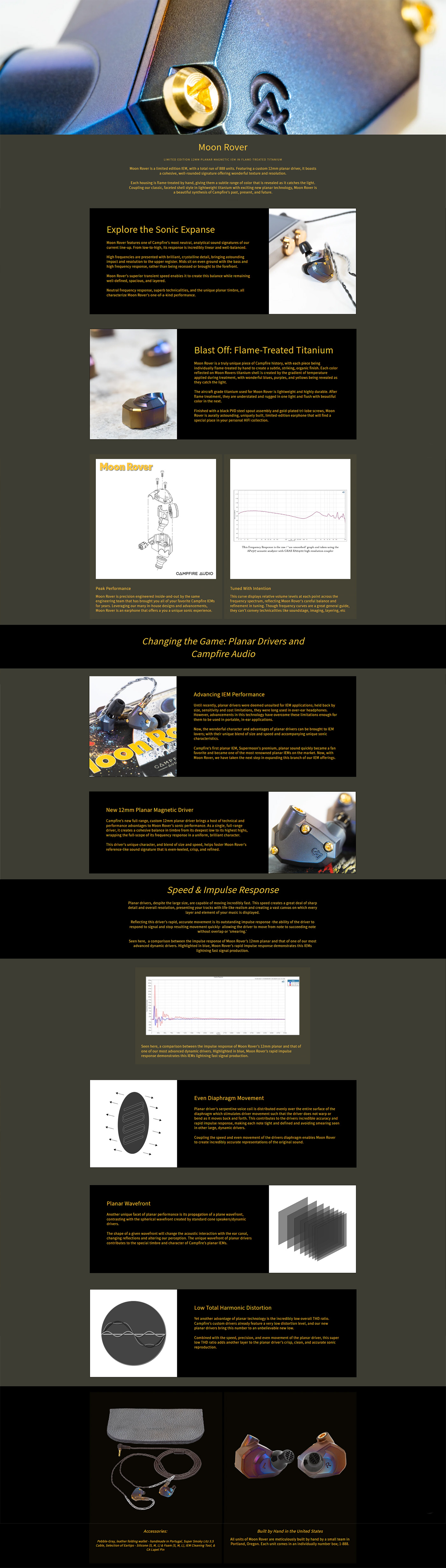 A Moon Rover a Campfire Audio új, limitált kiadású fülhallgatója, amely saját fejlesztésű, 12mm-es planár meghajtójával körözi le a hasonló árú DD és BA meghajtós fülmonitorokat. A planár technológiával kimagasló impulzusválaszra, gyors és pontos frekvanciaátvitelre, valamint ultra alacsony torzításra lehet számítani. A fülhallgató háza kézileg színezett repülőgépipari titániumból készült és arany színű csavarokkal lett dekorálva.