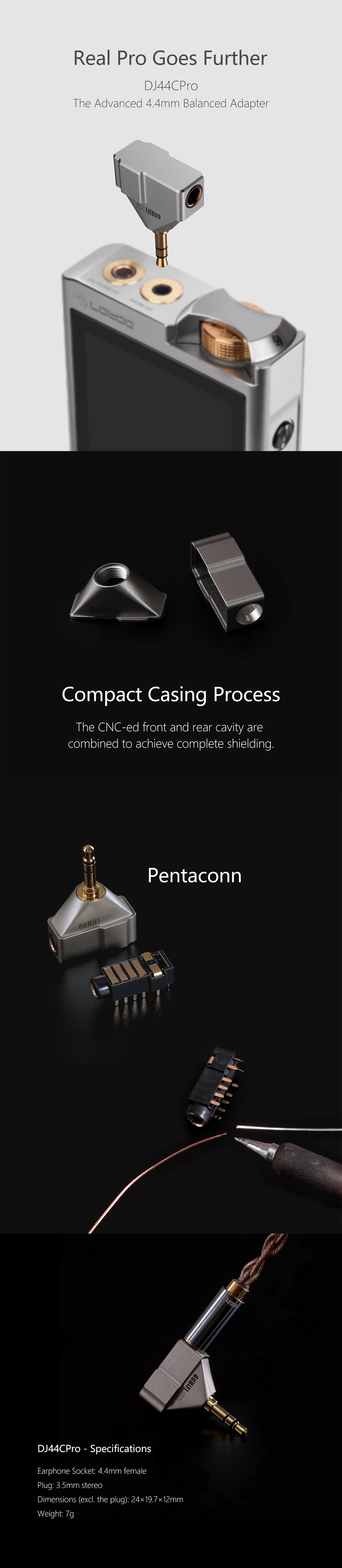 A DJ44CPro adapter lehetővé teszi a 4,4mm-es Pentaconn csatlakozóval ellátott fül-, vagy fejhallgatók használatát 3,5mm-es Jack bemenetű digitális audió lejátszó (DAP), digitális-analóg konverter (DAC), vagy erősítő (AMP) eszközökkel. A CNC mart alumínium házban a Pentaconn által Japánban gyártott 4,4mm-es csatlakozón kívül a ddHiFi saját 49 szálból tekert Nyx réz belső kábelezése teszi emeli ezt az adaptert professzionális szintre.