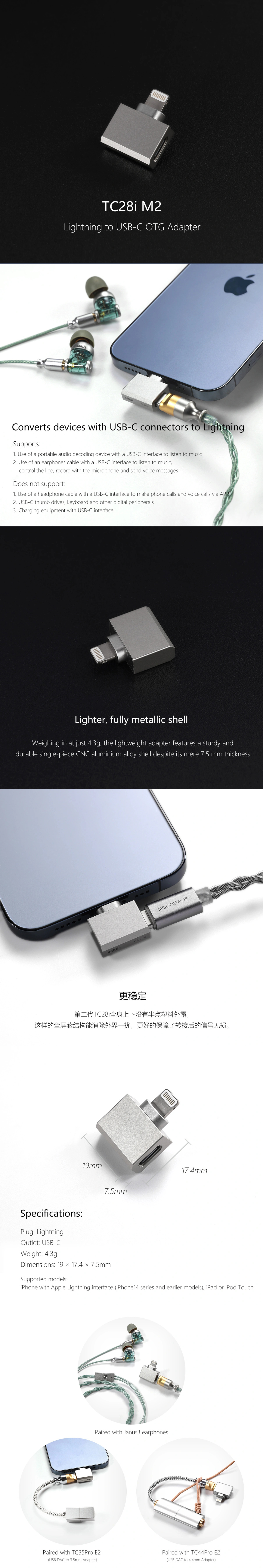 A ddHiFi TC28i M2 adapter lehetővé teszi, hogy a Lightning kompatibilis Apple készülékekhez USB Type-C csatlakozójú eszközöket csatlakoztassunk. A TC28i M2 a modell második generációja, elődjéhez képest a háza még könnyebb CNC alumínium ötvözetből készült, valamint stabilabb kapcsolatot biztosít. DAC-ok (digitális-analóg konverterek) csatlakoztatására alkalmas a megfelelő OTG kábelen keresztül.