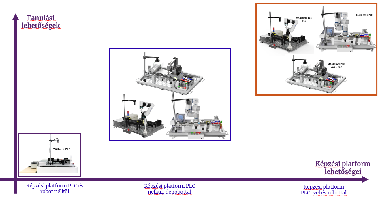 A kollaboratív robotkarok megismeréséhez elengedhetetlen eszközökkel rendelkező oktatórendszer, mely által a képfeldolgozással, futószalagos gyártásszimulációval, illetve a megfogók működtetésével és beüzemelésével képezhetik tovább robotikai szaktudásukat. A csomag alapvetően rendelkezik a futószalag, és vizuális egység kiegészítőkkel, ezek mellett a beüzemelésükhöz és működtetésükhöz szükséges szerszámokkal és munkadarabokkal is. A csomaghoz ezek mellett szabadon választhat PLC modul kiegészítőt, illetve három különböző típusú kollaboratív robotkart melyek a Magician E6, Magician Pro MG400, illetve CR3 megnevezésű robotkarok.