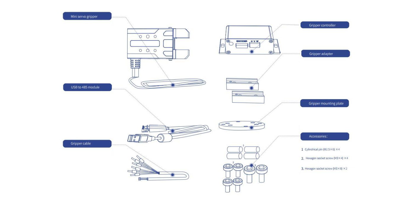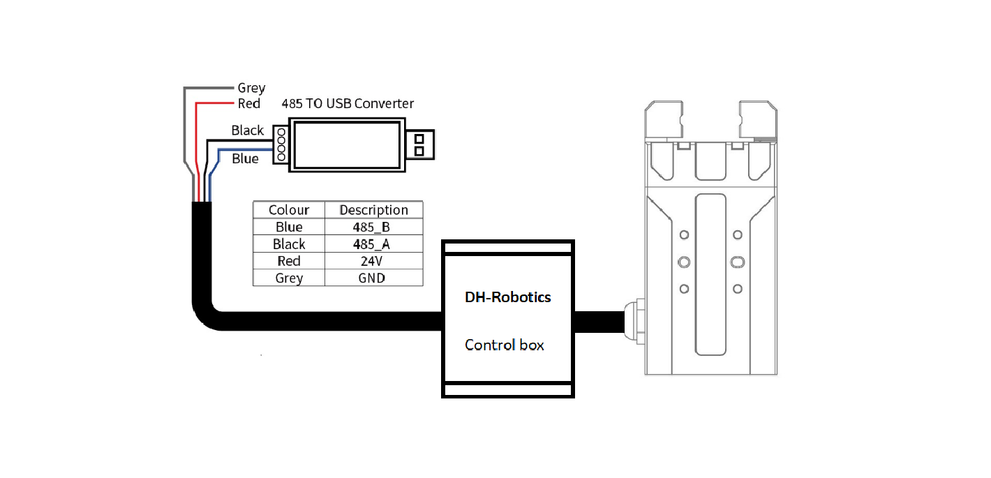 Egyszerű bekötés, egyszerű beüzemelés. A felhasználói útmutató részletes leírásokat tartalmaz a megfogó szerszám bekötéséhez, a megfogóhoz kapható RS485 - USB átalakító segítségével pedig a DobotStudio Pro szoftverben is programozható.