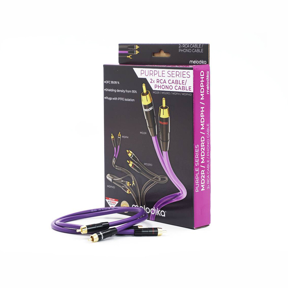 A Melodika MD2R Purple Series RCA összekötő kábel 4N tisztaságú OFC réz vezetőkkel és 0,35 mm² keresztmetszetű, finom szálas „Single Core” felépítéssel biztosít tiszta, természetes hangátvitelt. A több mint 99%-os lefedettségű árnyékolás hatékonyan csökkenti a zajt, míg a 24 karátos aranyozott csatlakozók stabil, oxidációmentes érintkezést nyújtanak. Alacsony kapacitása miatt kiegyensúlyozott, nem éles magasakat és átlátható hangképet ad otthoni hifi rendszerekben.