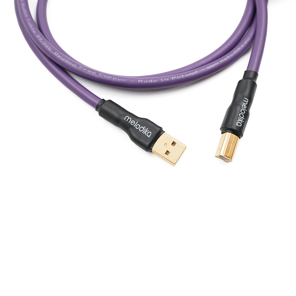 Melodika MDUAB prémium USB 2.0 A-B kábel, 4N tisztaságú OFC réz vezetőkkel és 4x0,2 mm² érátmérővel. A háromrétegű árnyékolás és a PE/PVC szigetelés stabil, zajmentes adatátvitelt biztosít, míg a 24K aranyozott csatlakozók javítják a kontaktust és csökkentik a jelveszteséget. Ideális DAC‑okhoz, audio interfészekhez és igényes digitális rendszerekhez.