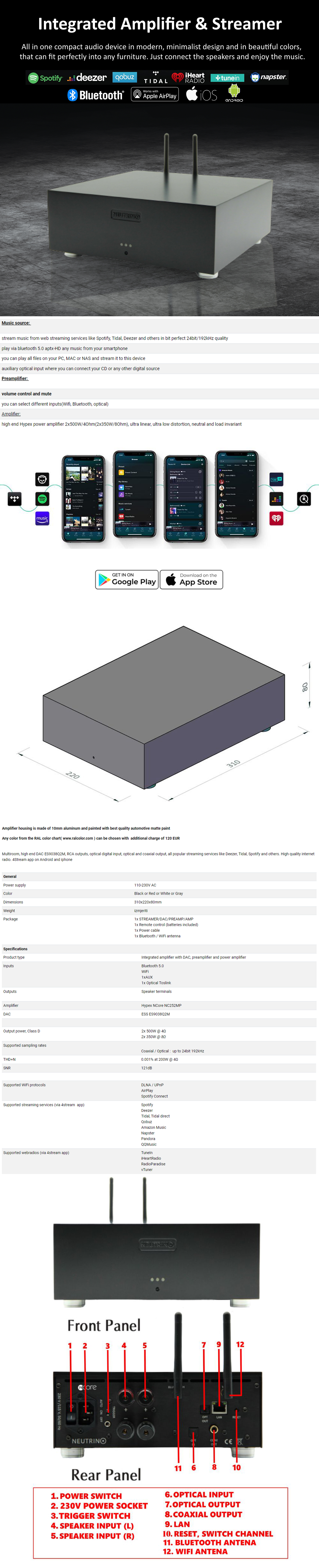 Neutrino Smartcube 500 streamer, integrált erősítő és DAC (digitális-analóg konverter) és előerősítője csúcskategóriás ES9038Q2M DAC chippel, Hypex NCore NC252MP erősítővel, optikai digitális bemenettel, hangszóró kimenettel. Lineáris erősítés, minimális torzítás. Deezer, Tidal, Spotify, és más népszerű streaming szolgáltatással kompatibilis, valamint kiváló minőségű internetes rádiózást nyújt. Vezetéknélküli vezérlés az ingyenes 4Stream alkalmazással Androidon és iPhone-on keresztül. Bluetoth 5 aptX HD csatlakozás és AirPlay 2 kompatibilitás. A doboz tartalmaz külső antennát a WiFi és a Bluetooth használatához, valamint távvezérlőt a hangerőszabályozáshoz és a bemenet kiválasztásához.