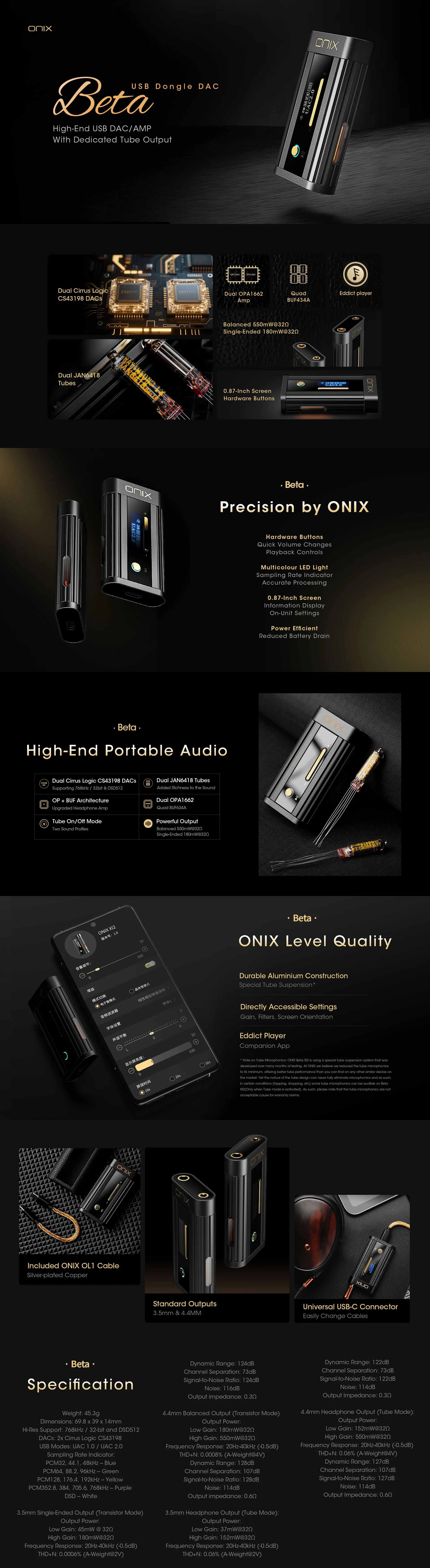Az ONIX XI2 Beta egy csúcskategóriás USB dongle DAC/AMP, amelyet hordozható audiofil teljesítményre terveztek. Két Cirrus Logic CS43198 DAC-kal rendelkezik, amelyek akár 768 kHz/32 bites PCM és DSD512 formátumot is támogatnak, és két JAN6418 csővel párosulnak a gazdag, testreszabható hangzás érdekében. A felhasználók válthatnak tranzisztoros és csöves mód között, a szimmetrikus kimeneti teljesítmény 550 mW @ 32 Ω. Az erősítő rész kettős OPA1662 és négy BUF634A chipet tartalmaz, amelyek kompakt formában biztosítják a pontosságot. Teljesítménye ellenére a Beta alacsony akkumulátor fogyasztásra és széles körű kompatibilitásra van optimalizálva az UAC 1.0/2.0 segítségével.
