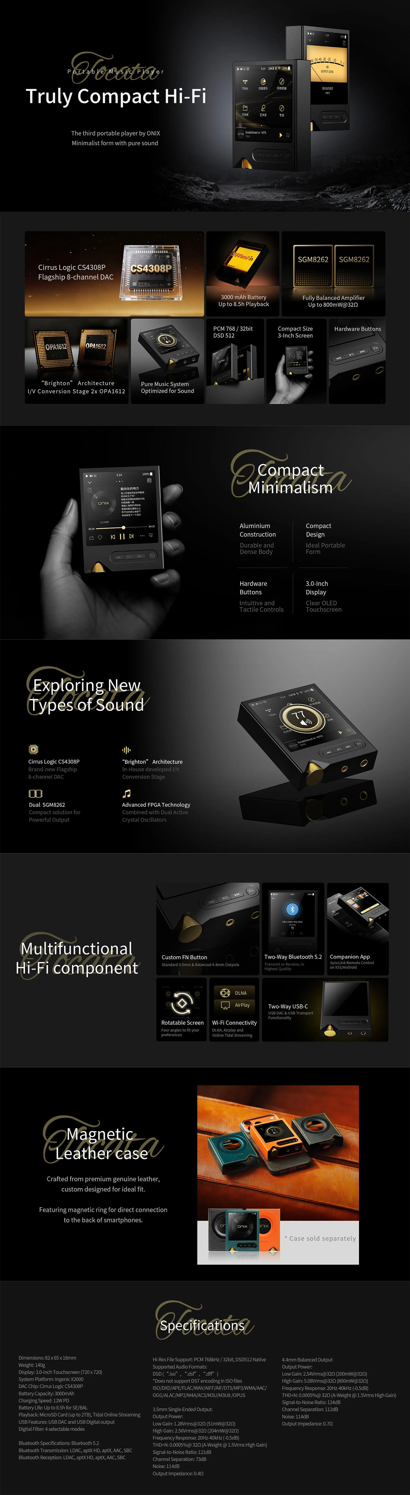 Az eltéveszthetetlen ONIX dizájn megegyezik az Overture, Mystic és Miracle termékekkel, a ház CNC mart alumíniumból készült. A 140g súlyú robusztus és erős fekete ház egy elegáns aranyozott hangerő tárcsával és négy fizikai gombbal készült. A nagyfelbontású OLED kijelző mögött egy 3000mAh kapacitású akkumulátor rejlik, mely maximálisan 8 óra üzemidőt is elérhet a 3.5mm SE kimeneten keresztül és a Type-C porton át tölthető.