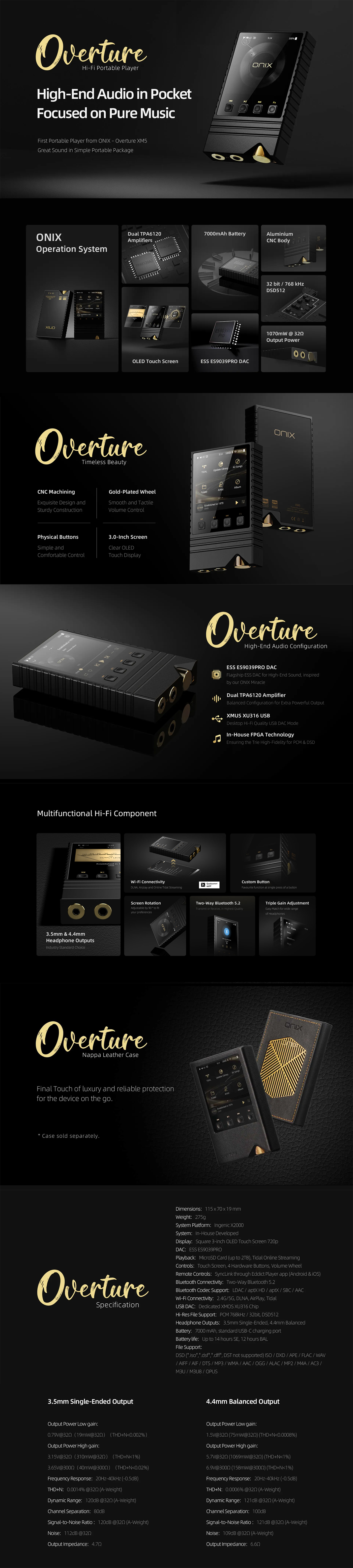 ONIX első hordozható lejátszója. Az XM5 remek visszajelzésekkel indult a piacon, specifikációiban a Shanling M5 Ultrával mérhető össze, mégis brit gyökereknek megfelelő meleg, mégis részletgazdag hangzásra lehet számítani. A Miracle streaming stack által insprált Overture a kiváló ES9039PRO DAC (digitális-analóg konverter) chippel, valamint a kettős TPA6120A2 erősítővel meghaladja az 1W @ 32 Ohm teljesítményt, 32bit 768kHz és DSD512 felbontást nyújt. A hangzás dinamikus és nagy részletességű, a vokálok energikusak, mégis finomak. A házon 3.5mm SE és 4.4mm BAL fejhallgató kimenetekhez a menüben egy háromállású erősítés mód társul, ezáltal a legtöbb fül- és fejhallgató számára megfelelő felhasználási élményt ad.