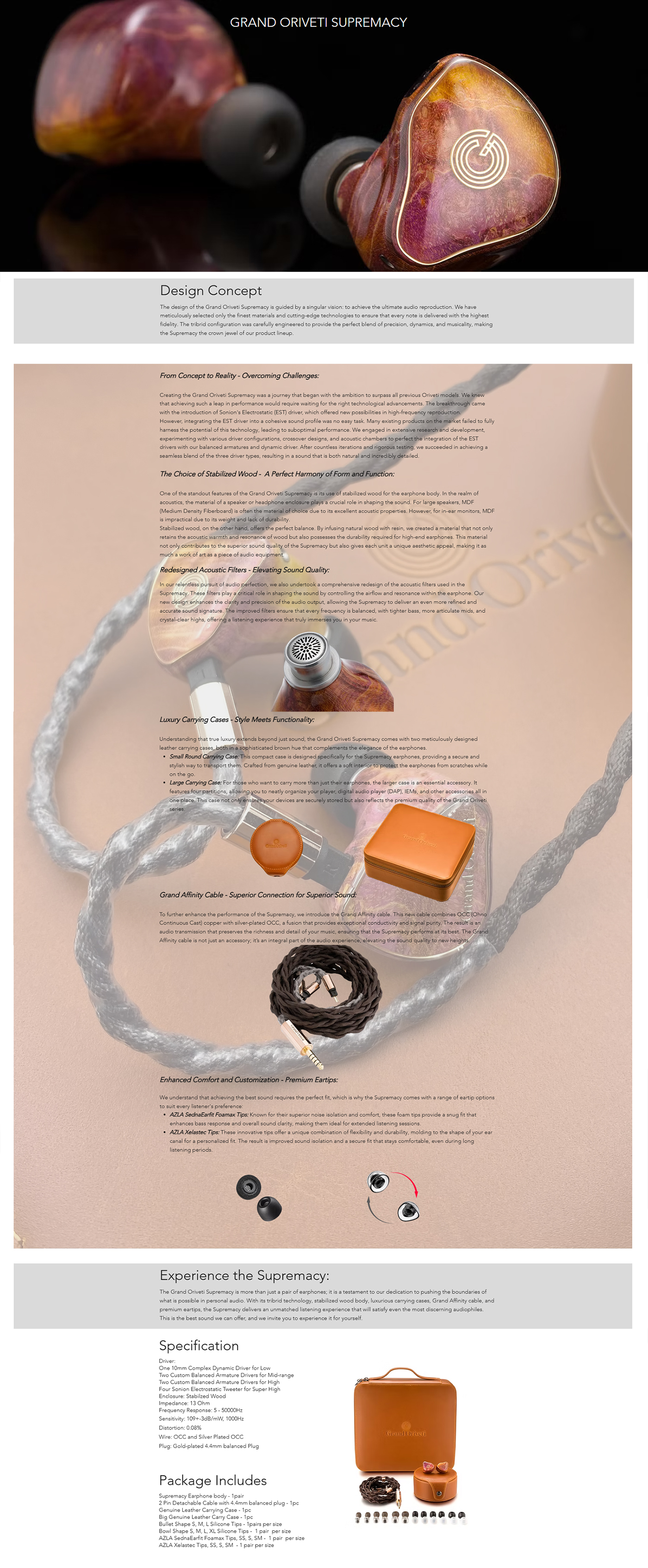 A Grand Oriveti Supremacy néven is fellelhető high-end fülhallgató a zenehallgatás valódi ínyenceinek készült. A csomag tartalmazza a 2-Pin káblet, egy luxus hordozó tokot, valamint különböző fülillesztékeket.