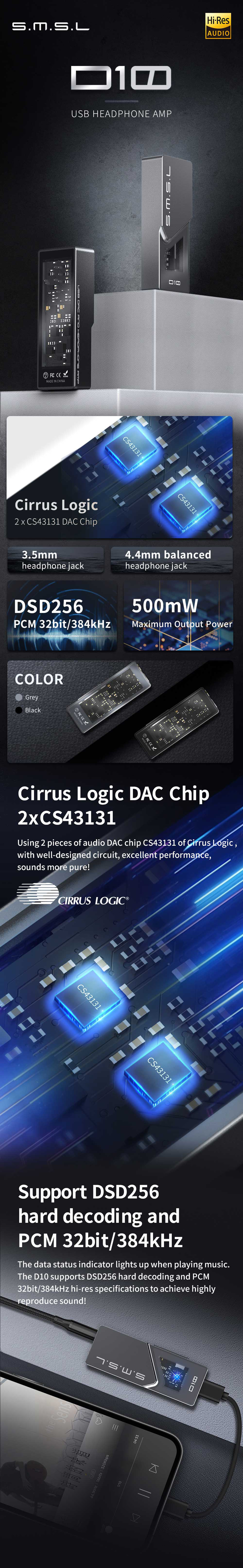 Az SMSL D10 egy nagyteljesítményű hordozható digitális-analóg konverter és fül-/fejhallgató erősítő, amely kettős Cirrus Logic CS43131 chippel nyújt kiváló minőséget és kellő teljesítményt akár nagyigényű fejhallgatók meghajtására is.