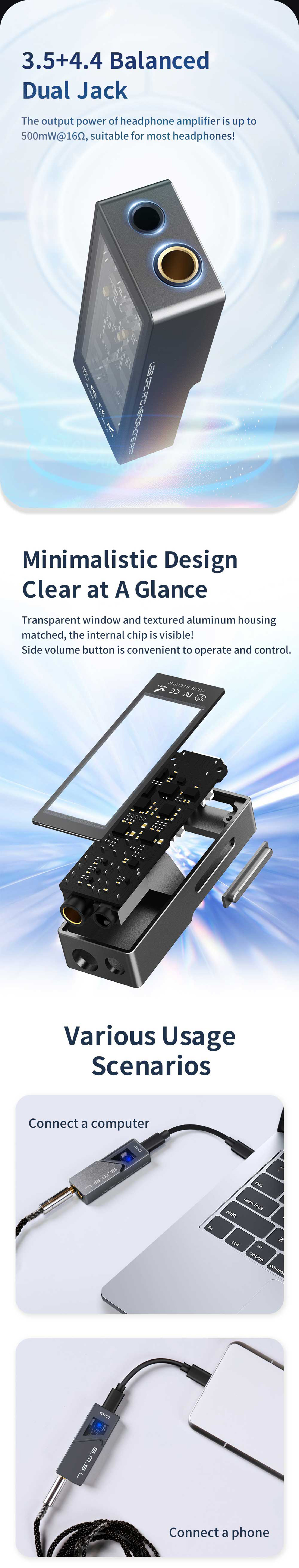 A D10 Type-C kábelen keresztül a legtöbb modern okoseszközhöz csatlakozik, valamint a 3.5mm és 4.4mm-es szimmetrikus csatlakozójú fülhallgatók és fejhallgatók számára nyújt megfelelő jelerősítést, akár 16 Ohmtól 600 Ohmig.
