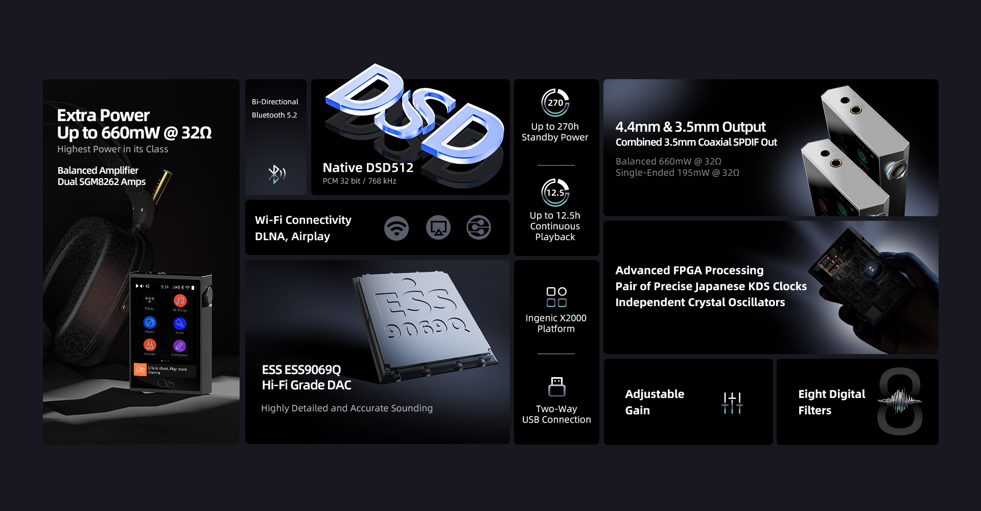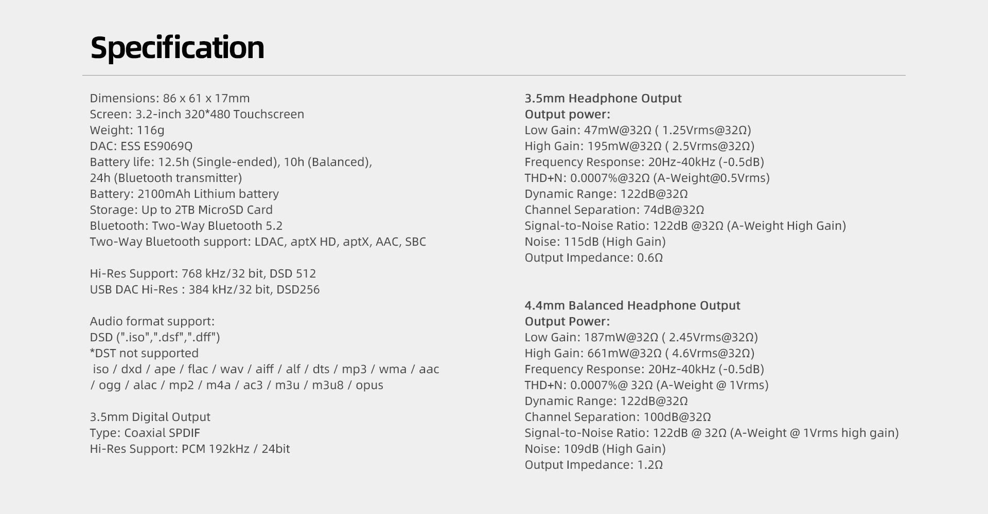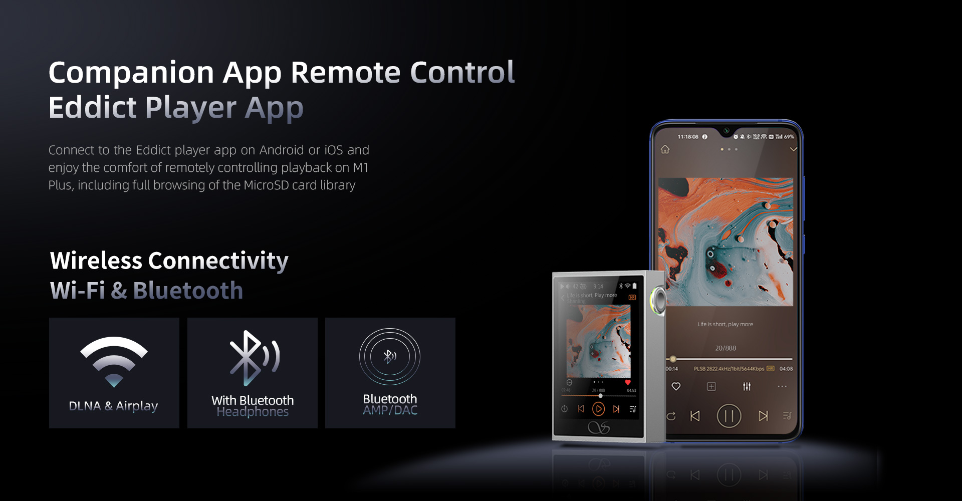 Az M1S digitalis lejátszó technikailag és esztétikailag továbbfejlesztett változata rendkívül nagy hanghűséggel. Az MTouch operációs rendszerű M1 Plus egy továbbfejlesztett digitális/analóg átalakítóval rendelkezik, amely az ESS ES9069Q chipen alapul. Kapott egy új erősítő fokozatot és egy 5.2-es verzióra frissített Bluetooth-vevőt, Tidal online streaming támogatást, illetve megjelenését is modernizálták, hogy a lehető legergonomikusabb legyen. Ennek eredményeképpen az M1 Plus tökéletes tars a minőségi zenehallgatáshoz, akár útközben, akár otthon. A lejátszó súlya mindössze 116g. A csomag tartalmaz egy USB-C kábelt és kijelző védő fóliát is.