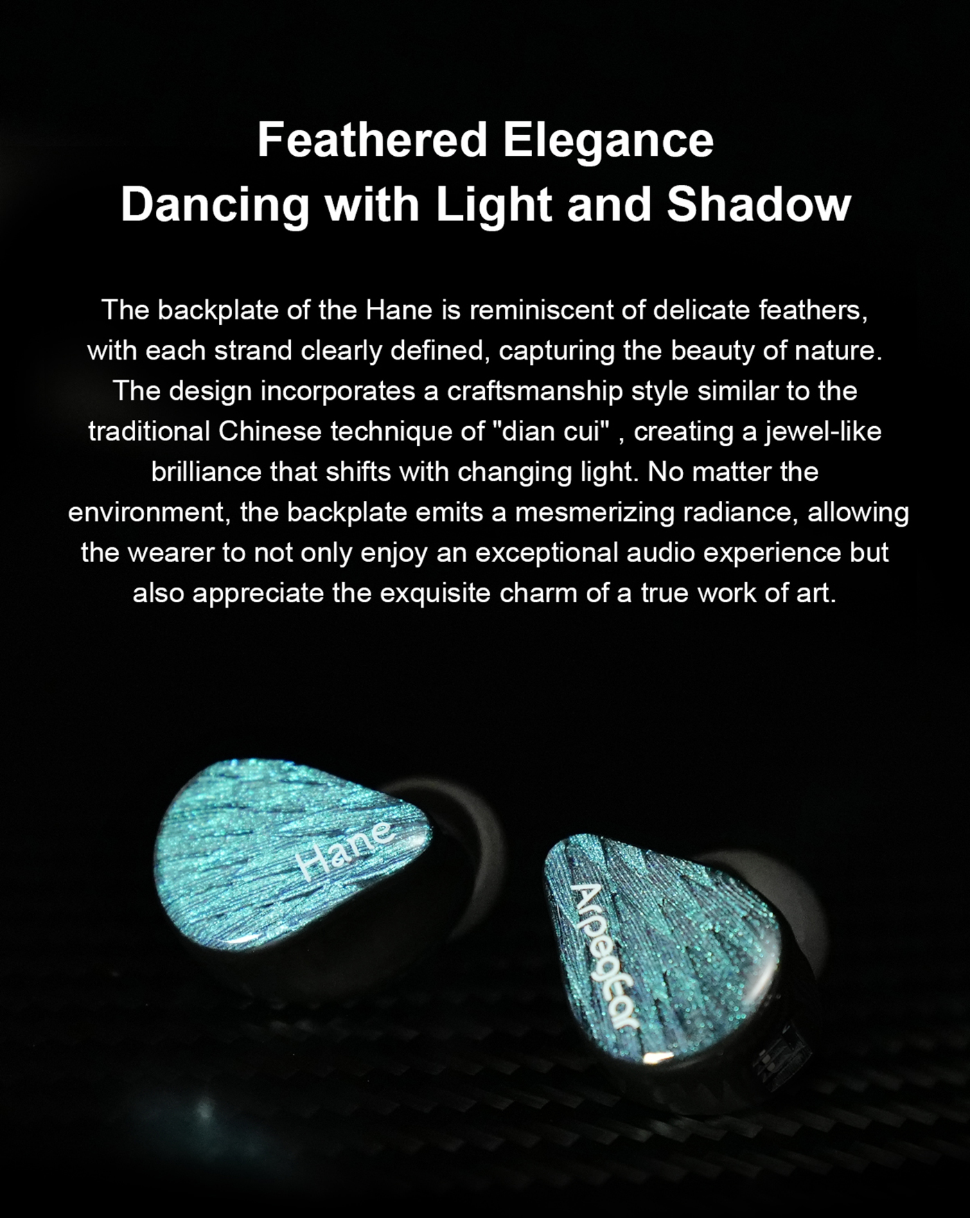 A Hane szó japánról fordítva tollat, vagy szárnyat jelent, nem meglepően a fedlapja tollszerű mintájú részletekkel idézi fel a tradícionális dian cui ékszerkészítési technikát, amely során kék jégmadár tollak felhasználásával dekorálnak ruházati kiegészítőket. Ennek a kialakításnak köszönhetően a fény hatására a fülhallgató minden szemszögből egy új oldalát mutatja meg. A Hane ergonomikus műgyanta házának kényelmes formaterve hosszas viseletet garantál minimális fáradtság érzettel.