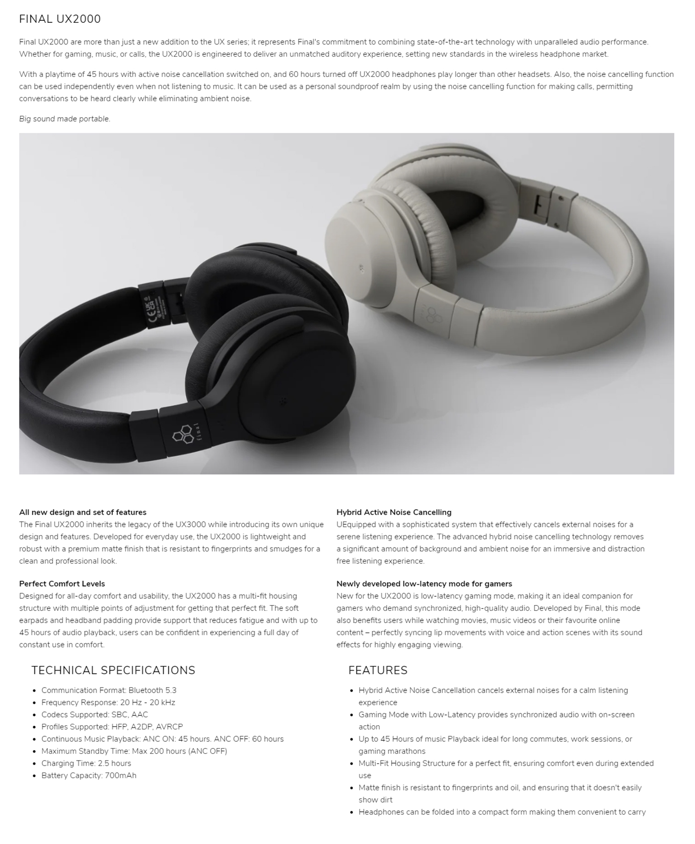 A final UX2000 Bluetooth 5 fejhallgató hibrid aktív zajszűréssel (ANC) rendelkezik. Az UX3000 dizájnjára építkezve egy újrahangolt, könnyű és kényelmes fejhallgatót kapunk, kristálytiszta hangzással. Az UX2000 kiváló játékokra és videoklipekre az aptX Low Latency késedelemmentes kodeknek köszönhetően. A többpontos csatlakozással pedig akár két eszközt is lehet párosítani a fejhallgatóhoz. Az UX2000 maximálisan 45 órányi üzemidővel rendelkezik, amit követően akár vezetékes fejhallgatóként is lehet használni a mellékelt 3,5mm-es kábelnek köszönhetően.