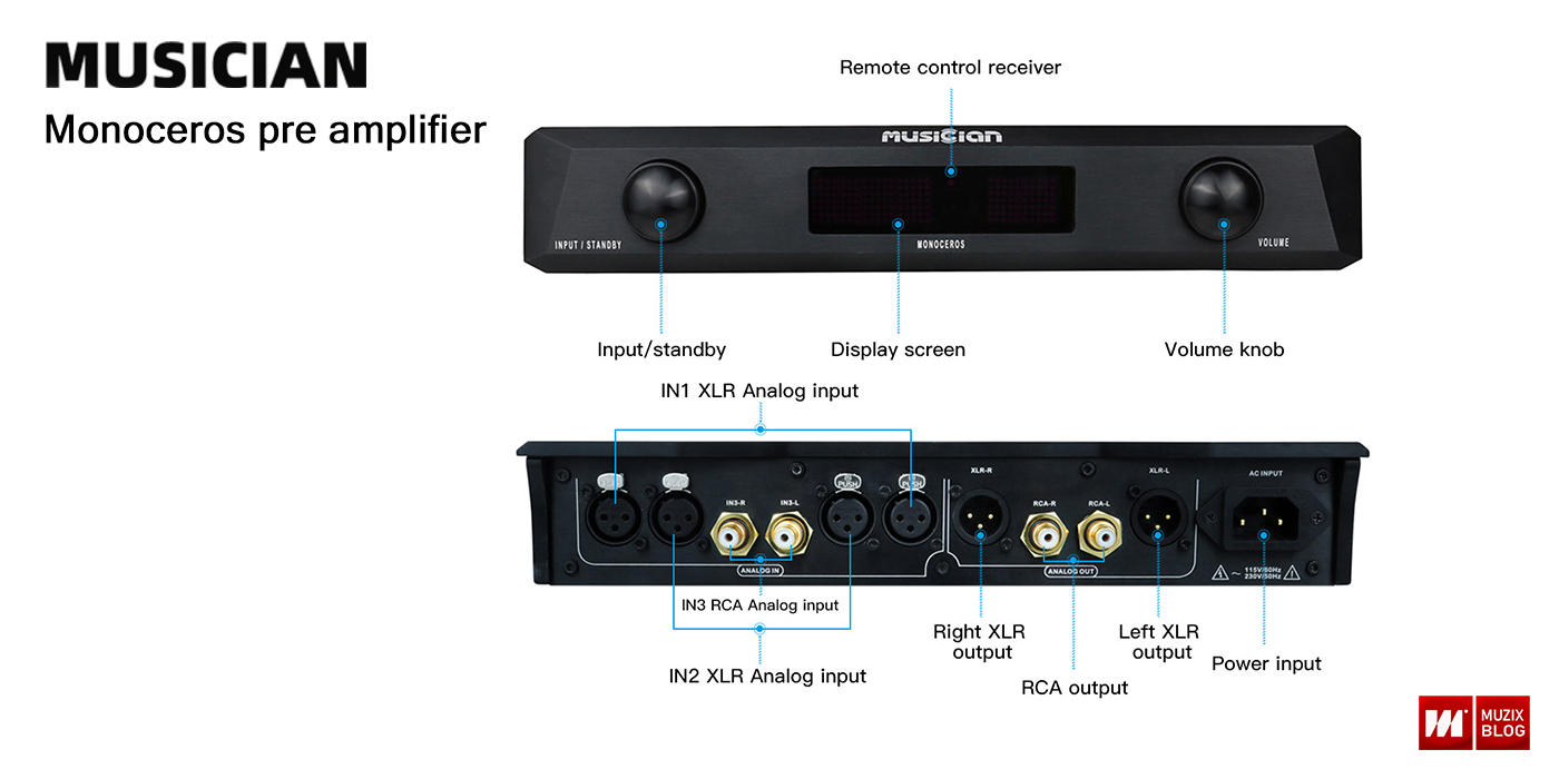 A Monoceros egy A osztályú, teljesen szimmetrikus jelfeldolgozású előerősítő. 2 pár szimmetrikus XLR és 1 pár hagyományos RCA bemenet. 1 pár szimmetrikus XLR és 1 pár hagyományos RCA kimenet. Infra távvezérlés. A Musician Monoceros 60 fokozatú hangerőszabályzót használ, amely egy mikroprocesszor és egy relé vezérlésen alapul. A felhasznált precíziós ellenállások tökéletes egyensúlyt tesznek lehetővé a csatornák között, és csak 0,0003%-os THD+N-t biztosítanak. A Musician Monoceros különálló tápegysége 60 W-os toroid réztekercs-transzformátorral rendelkezik. Ez a gondosan megtervezett tápegység alacsony zajszintet és mély basszust biztosít, miközben gazdag, pontos hangzást és széles hangteret biztosít.